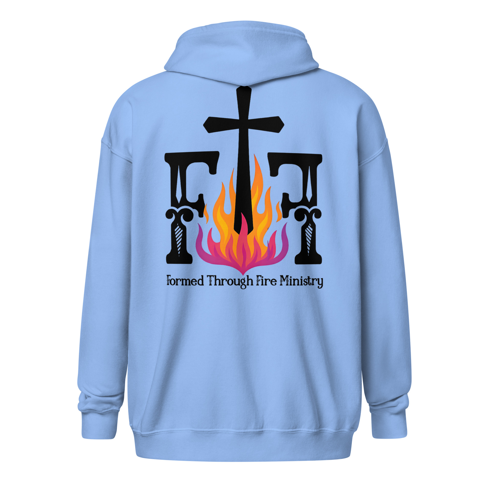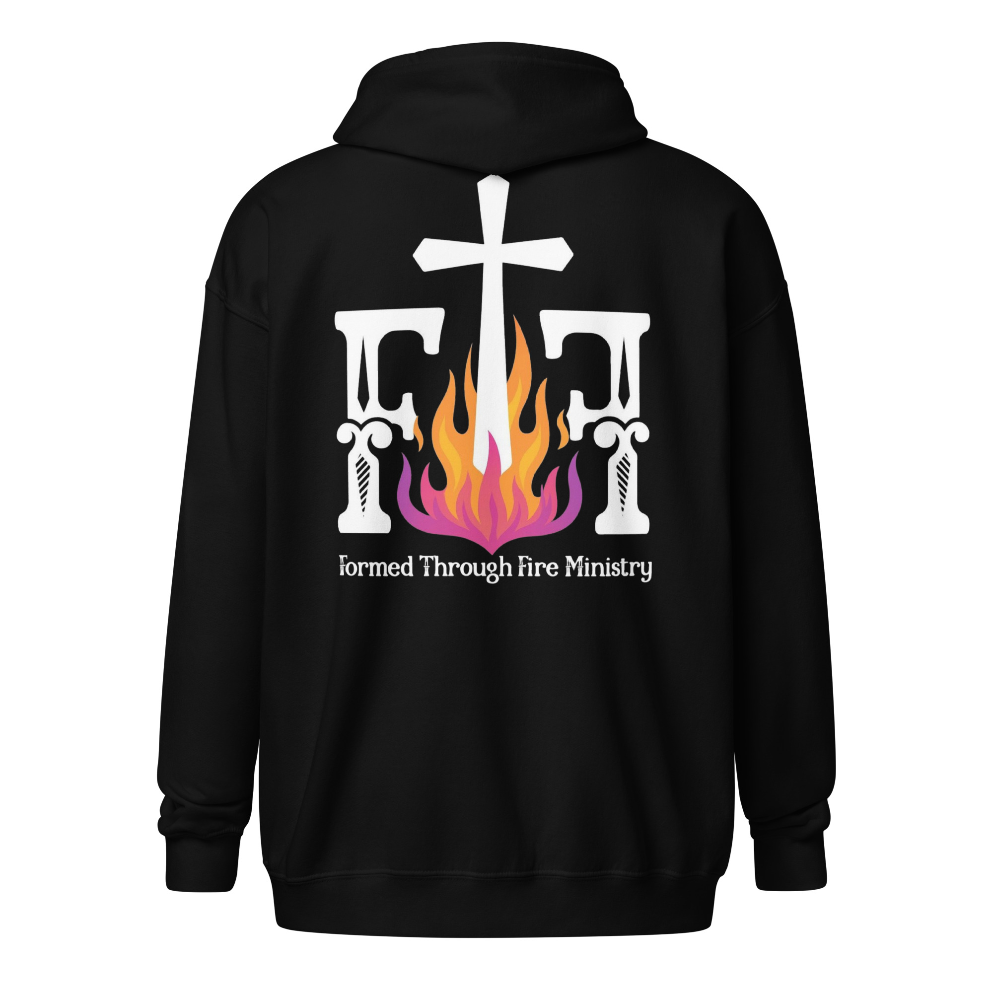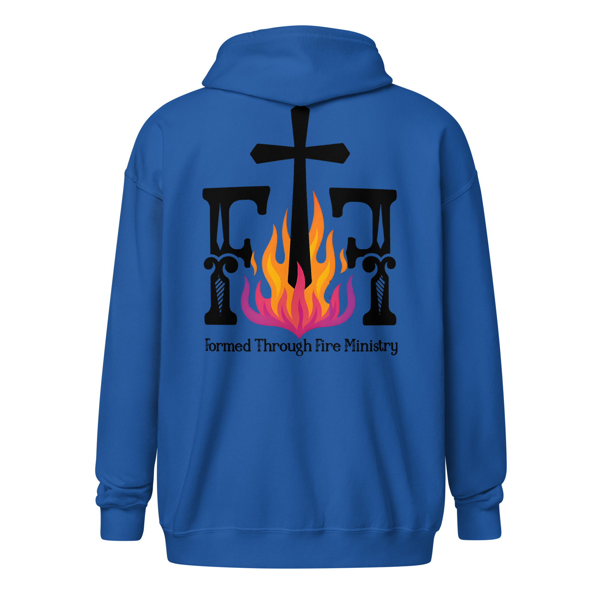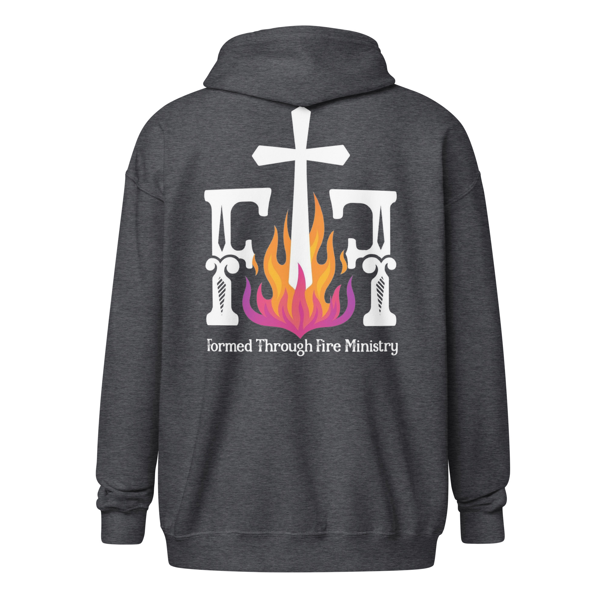 Carry the message of Formed Through Fire Ministry with you wherever you go. Designed for both style and comfort, this Heavy Blend Zip Hoodie is more than just apparel — it’s a statement of faith, resilience, and community. With its soft fleece interior and exterior, sturdy metal zipper, and color-matched drawstrings, it’s built to be your go-to layer for everyday wear, while also serving as a reminder of the mission you’re a part of.